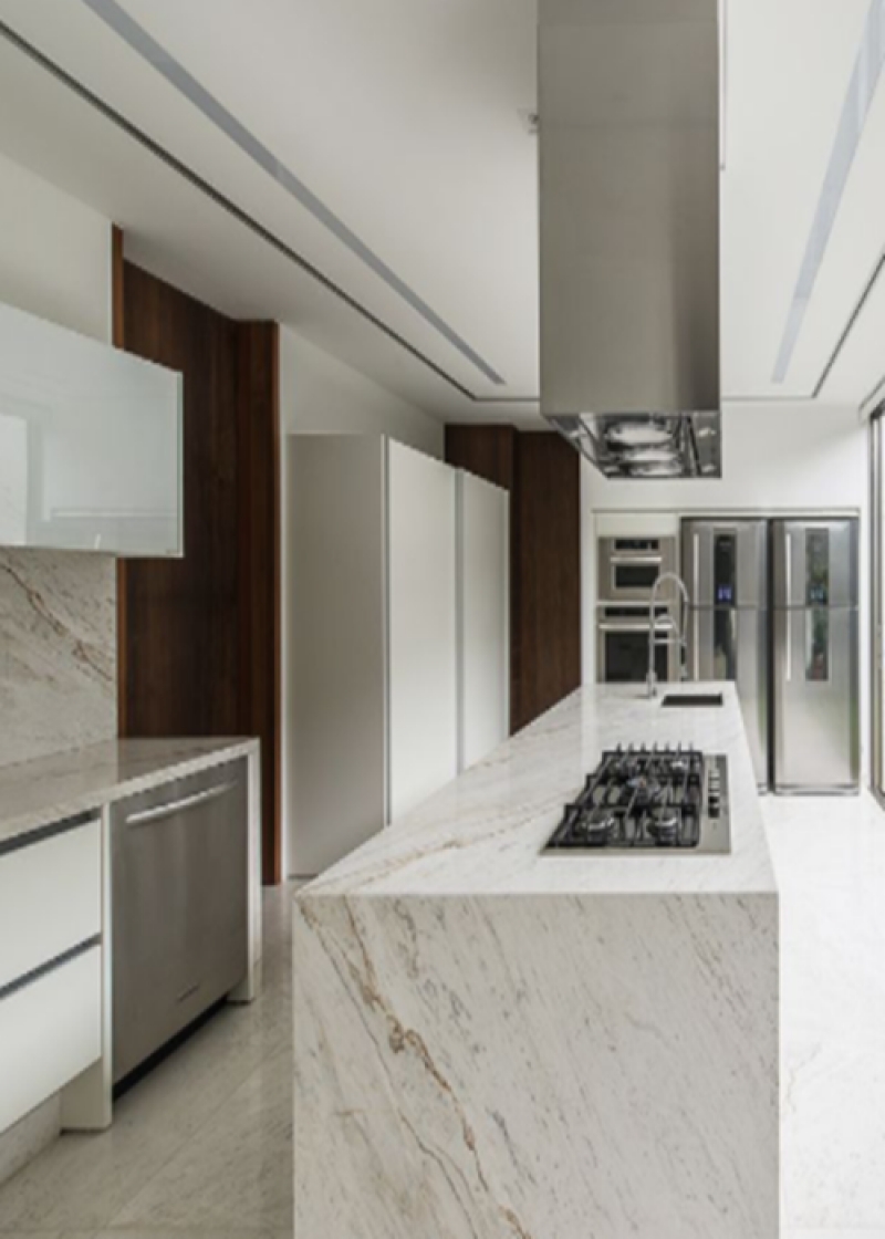Cozinha em mármore as características do mármore e do granito é seu aspecto cristalino, que quando usado na cozinha a torna luxuosa e moderna