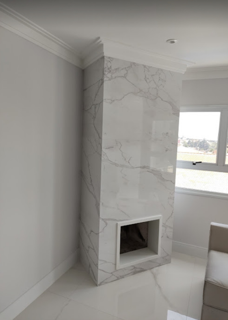 O contorno de uma lareira feito em mármore e granito valoriza não somente a lareira, mas toda a peça como uma verdadeira peça de decoração